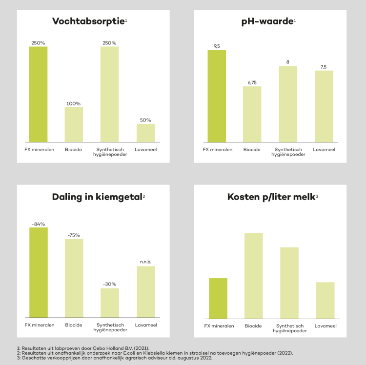 Boxenstrooisels op basis van kleimineralen doen beter hun werk dan de meest verkochte, chemische hygiënepoeders. De FX-mineralen scoren beter op vochtabsorptie, pH-waarde, kiemgetal-daling en kosten, zo blijkt uit diverse lab- en praktijkproeven. Het gebruik van de relatief nieuwe mineralenstrooisels groeit dan ook gestaag, aldus Berg Fourage (exclusief dealer van de FX-mineralenlijn).
